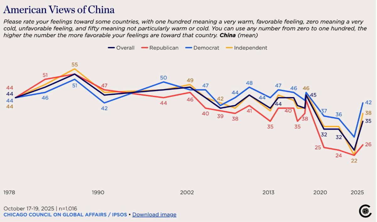 A Chicago Council survey shows 53% of Americans now favor cooperation with China, the first majority since 2019, driven by Democrats’ 19-point shift, though deep partisan divides persist on trade and security issues.芝加哥全球事务委员会(Chicago Council on Global Affairs)10月28日发布的调查报告显示,美国公众对华态度出现重大转变。报告基于7月至10月间对2000多名美国成年人的调查,发现53%的受访者支持对华“友好合作与接触”,这是自2019年以来首次过半数美国人倾向合作立场。同时,将中国视为“关键威胁”的比例从2023年的58%降至50%,对华好感度从2024年的历史低点24%回升至35%。尽管合作意愿上升,美国在关键领域的立场仍坚定:62%受访者视避免军事冲突为最高优先,58%强调维持科技领先,82%反对中国在亚洲建立势力范围。这一转变主要由民主党选民推动。高达66%的民主党人支持合作(较2024年激增19个百分点),而仅33%的共和党人持相同立场,形成33个百分点的党派鸿沟。这是对华问题自2006年首次列入调查以来的最大分歧。在贸易政策上,54%美国人反对单纯提高对华关税,但66%跨党派受访者支持“降低关税以换取中国削减贸易顺差”的交易方案。报告作者卡福拉(Craig Kafura)认为,持续关税战导致的通胀压力和生活成本上升,促使民众重新权衡对抗代价。报告认为,民意转变是“策略性而非战略性”,反映民众寻求“有管理的竞争”而非零和博弈。