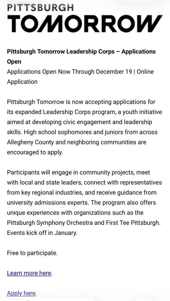 了解更多信息并报名(Learn more here):https://pittsburghtomorrow.org/leadership-corps/