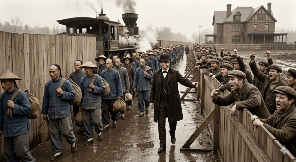 Scene description: On a drizzly morning in early 1872, at the Beaver Falls train station in Hull, the platform was temporarily closed off by a high wooden wall. Only a few guards and factory manager John Reeves were waiting. A train pulled up, its doors opening, and about 300 Chinese laborers filed out. They wore blue blouses with long braids trailing behind their heads, and carried coarse cloth bags on their shoulders. Silently, led by Reeves, they followed the temporary passageway inside the wall towards the nearby mansion. Outside the platform, a group of segregated white workers angrily waved their fists and hurled insults at the wall, their eyes filled with anger, surprise, and hostility.